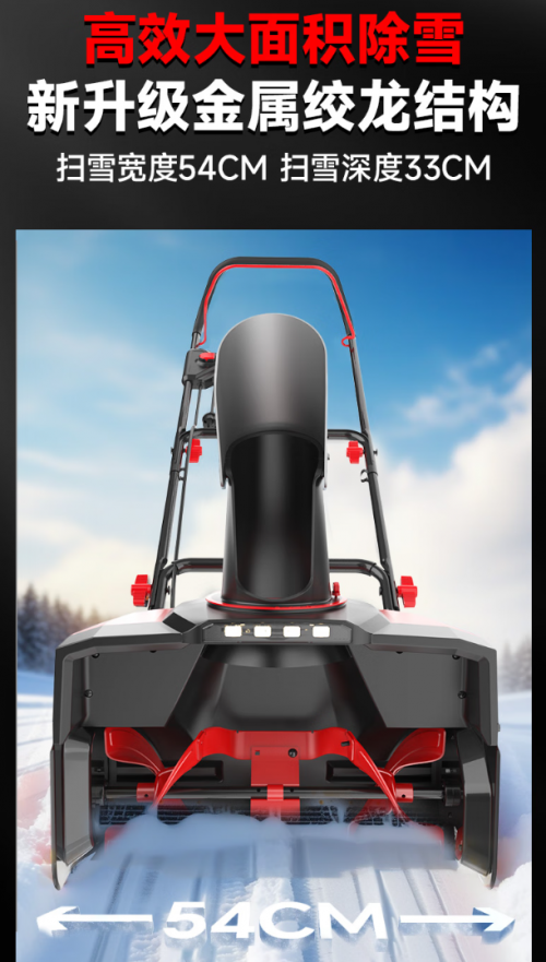 54cm超宽扫雪宽度:新升级金属绞龙结构,扫雪宽度达540mm,扫雪深度33cm,一次覆盖更大面积,减少重复作业时间,庭院、车道、人行道快速清扫无压力。
