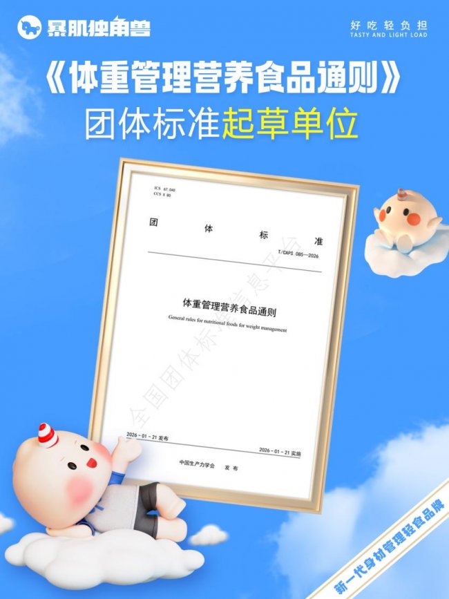近日,由中国生产力学会发布的团体标准《体重管理营养食品通则》(T/CAPS 085—2026)正式实施,标志着我国体重管理食品行业告别此前标准零散、规范缺失的发展阶段,迈入有章可循、科学发展的全新周期。作为《体重管理人群用黑咖啡》团体标准的主要参与单位,创立于2016年的健康轻食领域领军品牌暴肌独角兽凭借多年深耕市场的实践经验、严苛的产品研发标准及行业责任担当,完成了从优质市场参与者到标准共建者的角色跨越,以企业力量助推行业标准化、高质量发展。