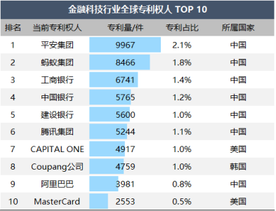 表 1 金融科技行业全球专利权人 TOP 10