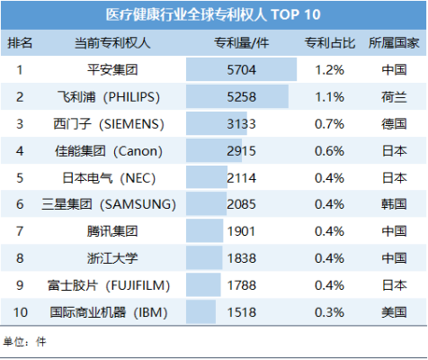 表2 医疗健康行业全球专利权人 TOP 10